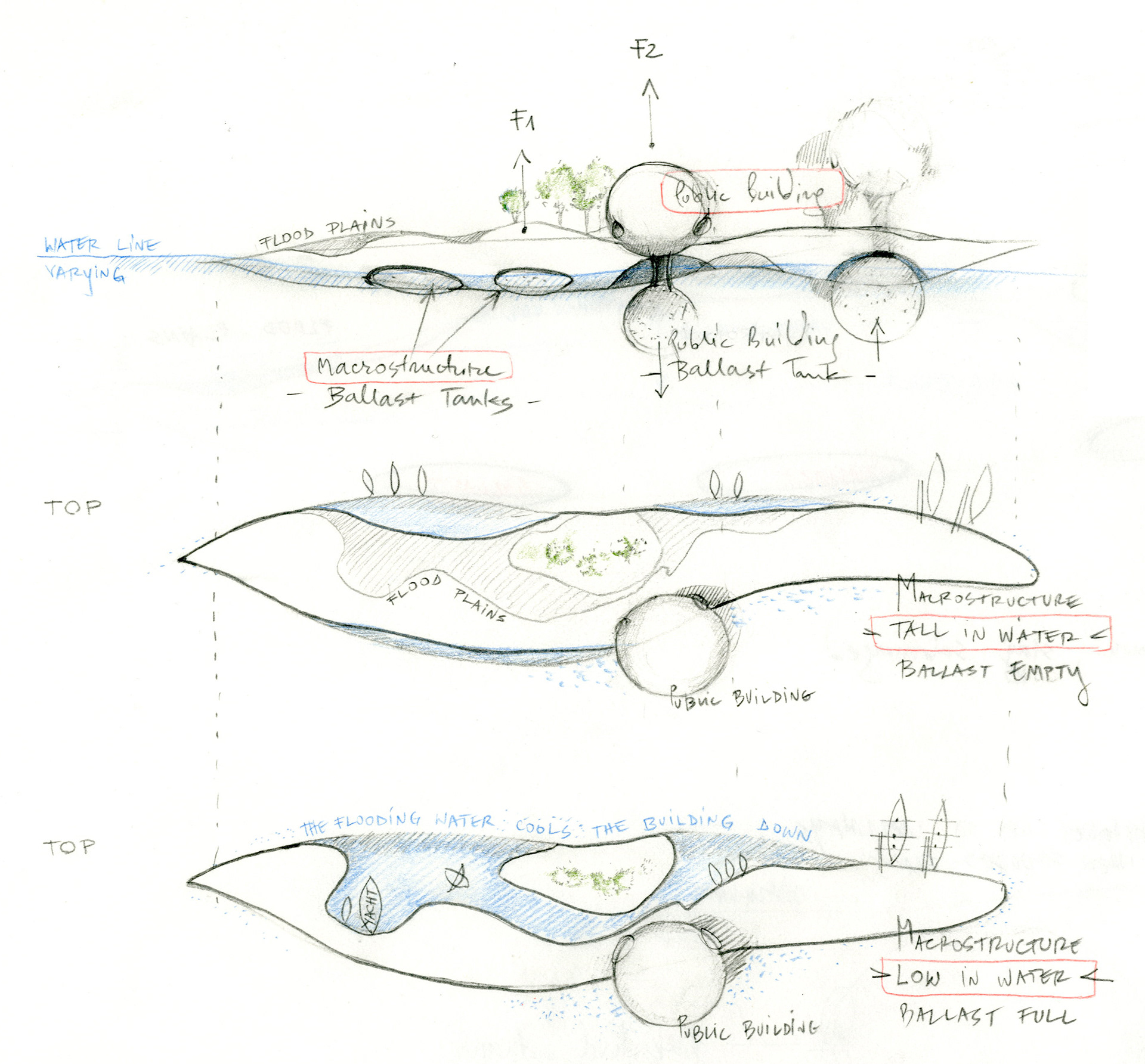 Most of the Macrostructure is essentially a fused mosaic of oversized flotation devices, simply serving to prop up a leafy leisure rooftop, as well as the still connected Flyer apartment towers superstructures (while their telescopic pillars are not yet firmly rooted in the sea bed). In this mosaic, a few independent floating sections with the same continuous green roof, have accessible hollow structures, so that they may function as public cultural spaces.